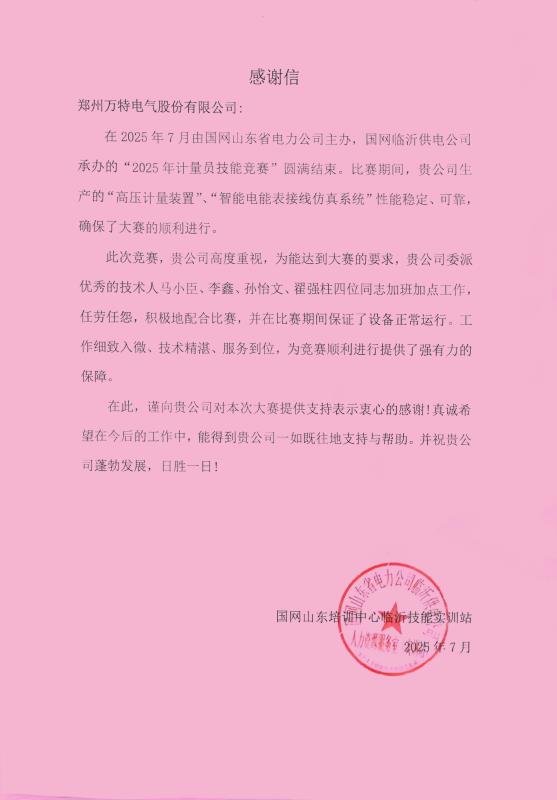 國網山東培訓中心臨沂技能實訓站在感謝信中特別提到:“貴公司技術人員任勞任怨,積極配合比賽進程,在高強度工作壓力下確保了設備零故障運行,為競賽順利進行提供了強有力的技術保障。”