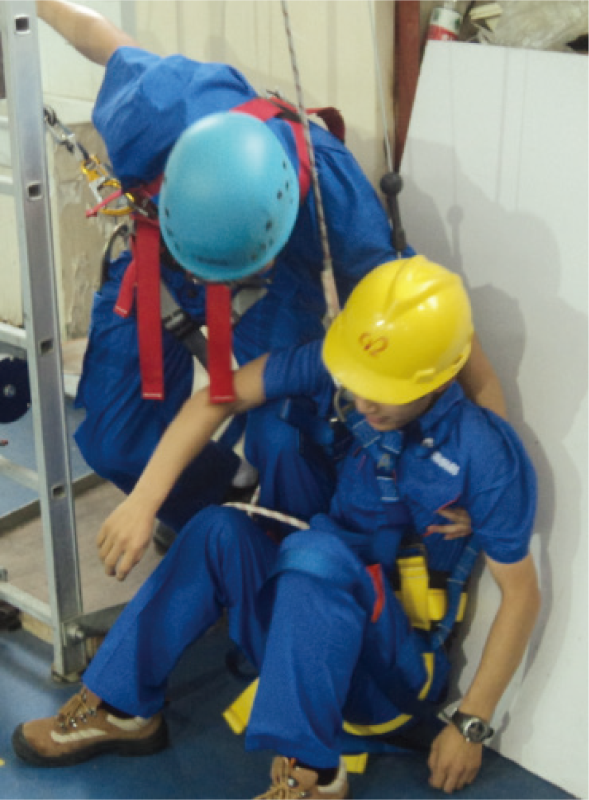 本項目在虛擬環境中模擬高空作業人員從高處墜落后發生安全帶吊掛事故,懸停在半空中等待救援的場景。施救 人員攜帶高空救援用品采用正確的施救方法將受困人員救回地面,訓練學員高空救援的技能。
